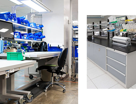 Static-dissipative laminate options are available for electronics manufacturing, preventing electrostatic discharge that can damage sensitive components. The workbenches also have integrated storage to keep essential tools within reach, streamlining workflow and minimizing downtime.