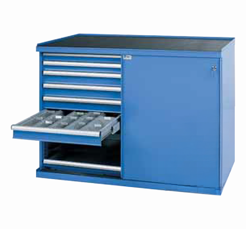 - Features: Side A drawers partitioned for tool accessories; Side B drawers fitted with tool holder frames and holders for 50 taper tools; Sliding doors (one per side) with locks to secure stored tools