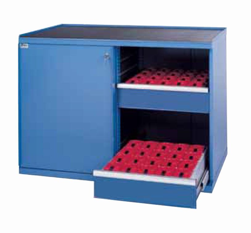 This double-width CNC cabinet works efficiently alongside rolling cabinet units to provide both mobility and secure tool storage.